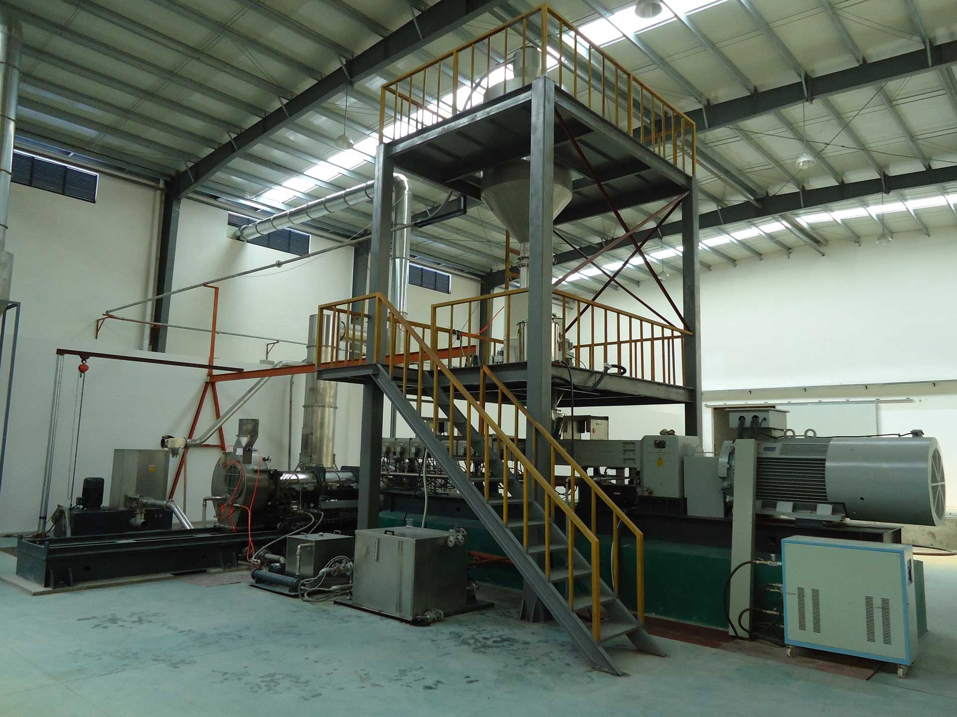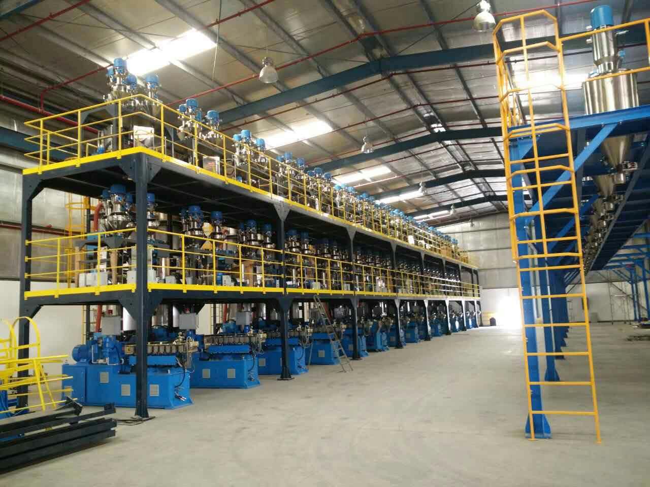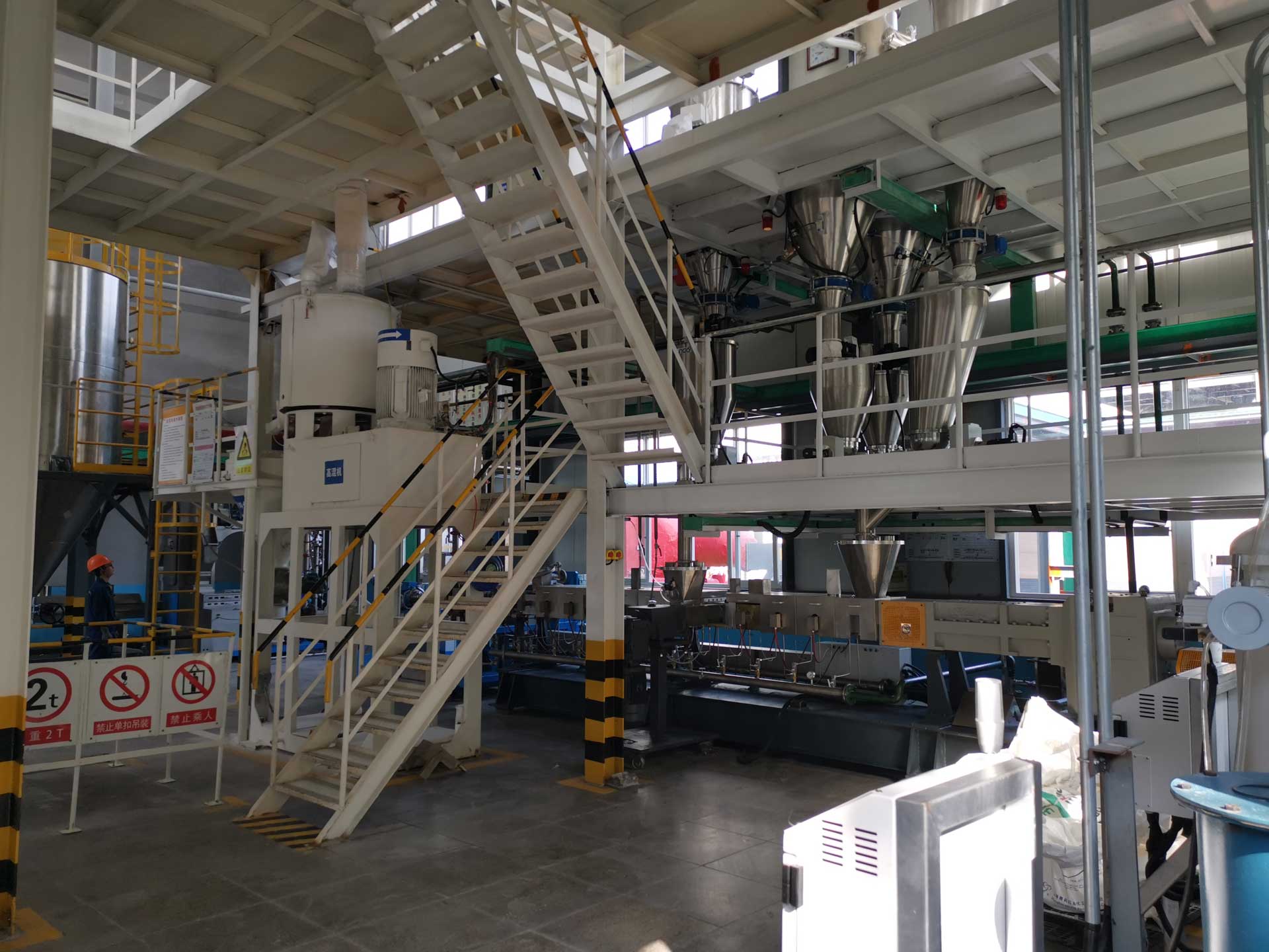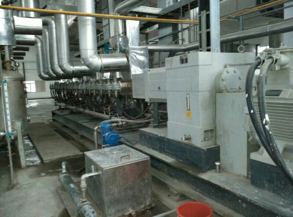 - 同向雙螺桿完成物料的塑化、混煉以及均化,開放無背壓熔體進入單螺桿擠出機完成造粒
