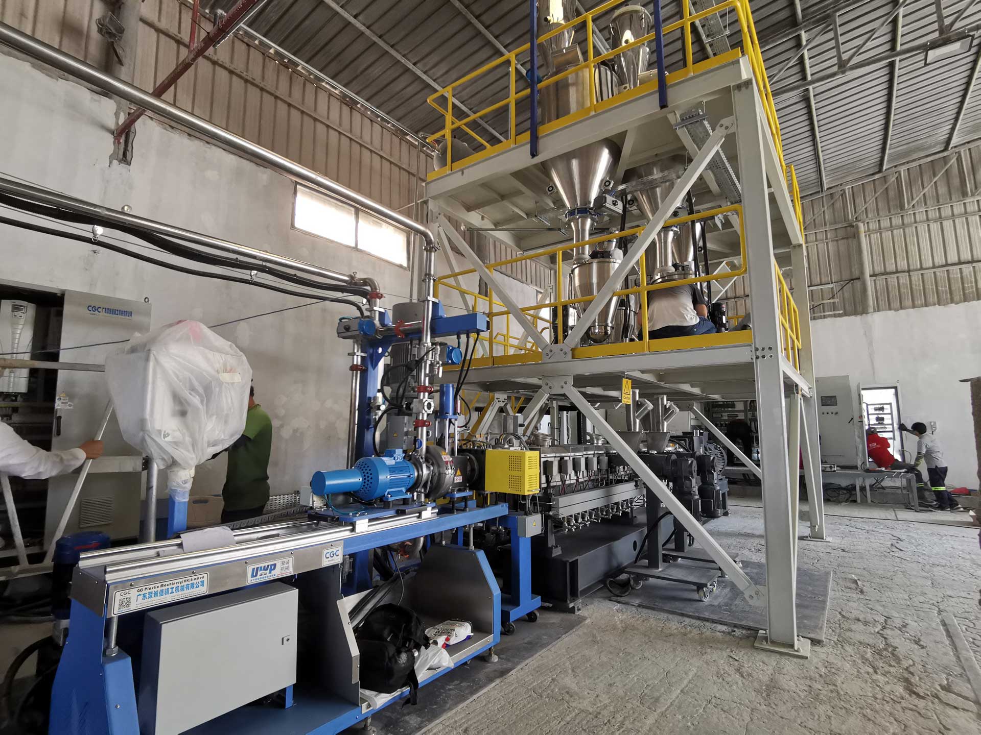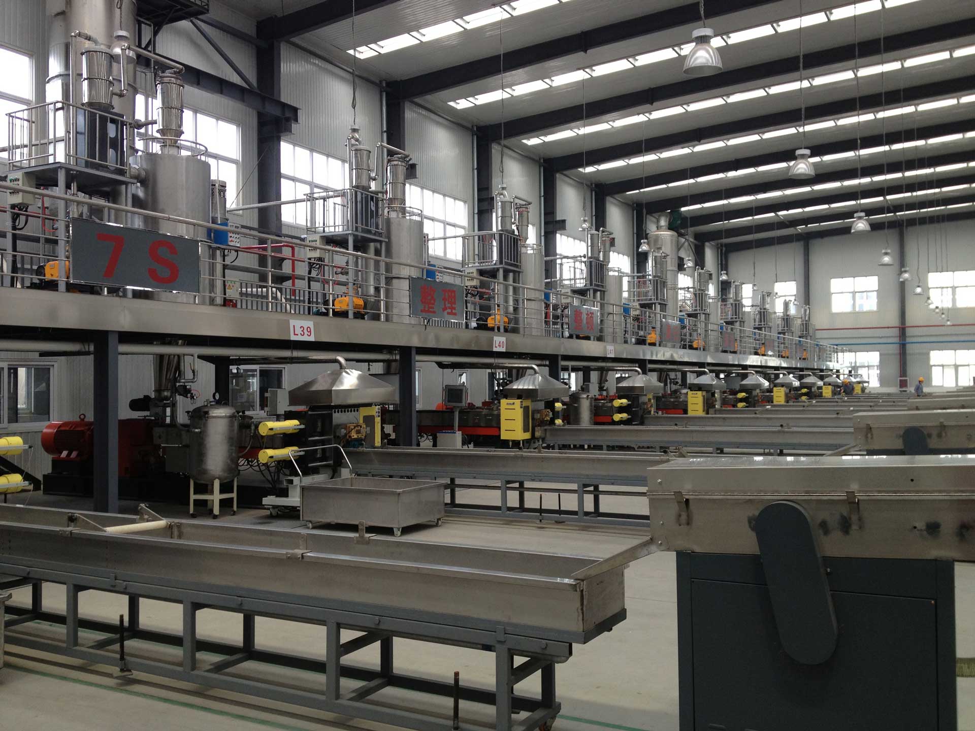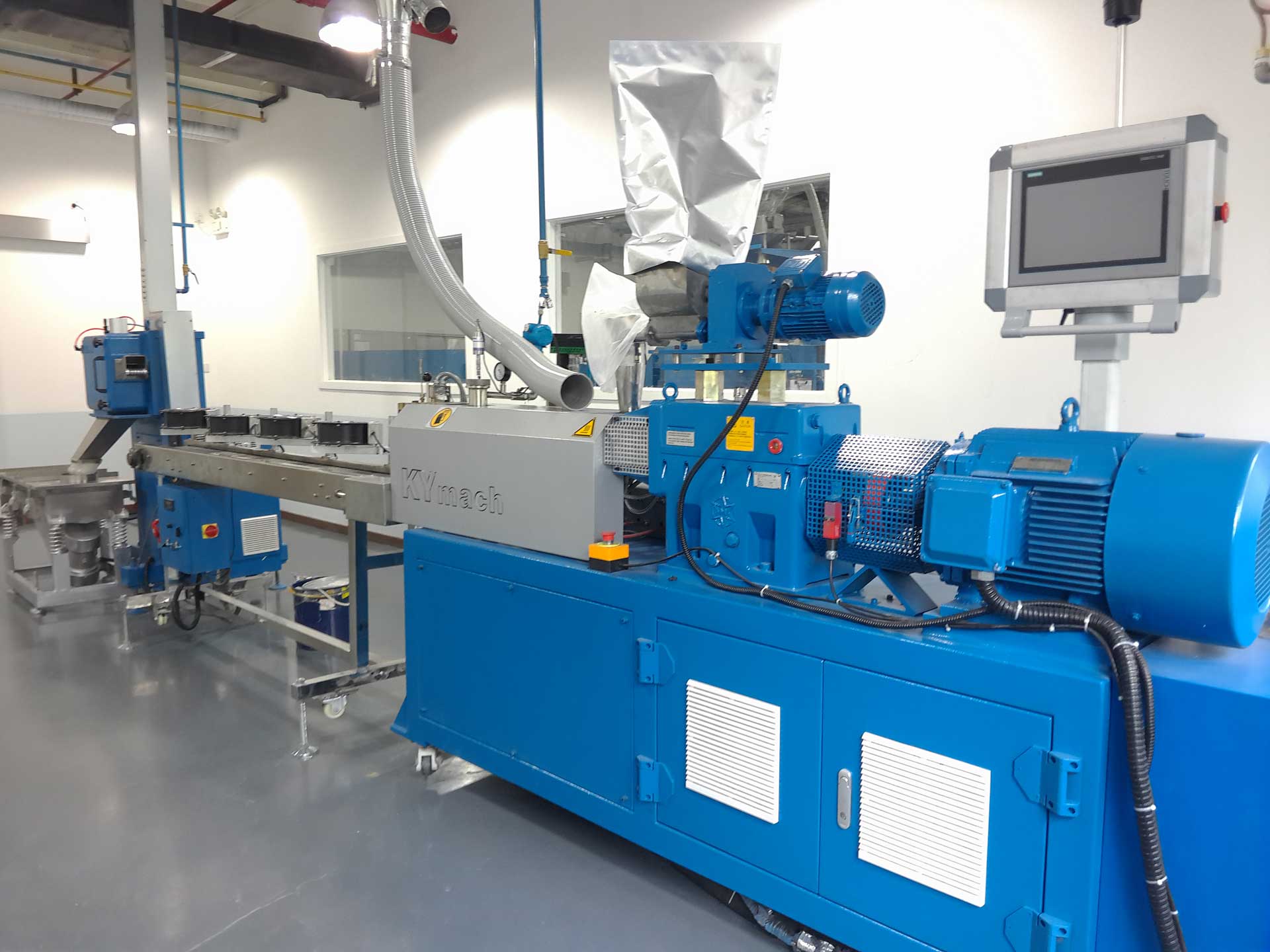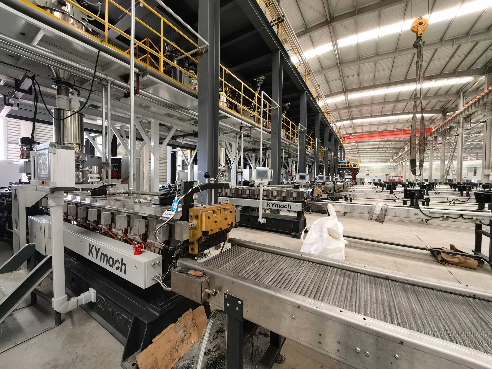 - 同向雙螺桿完成物料的塑化、混煉以及均化,開放無背壓熔體進入單螺桿擠出機完成造粒