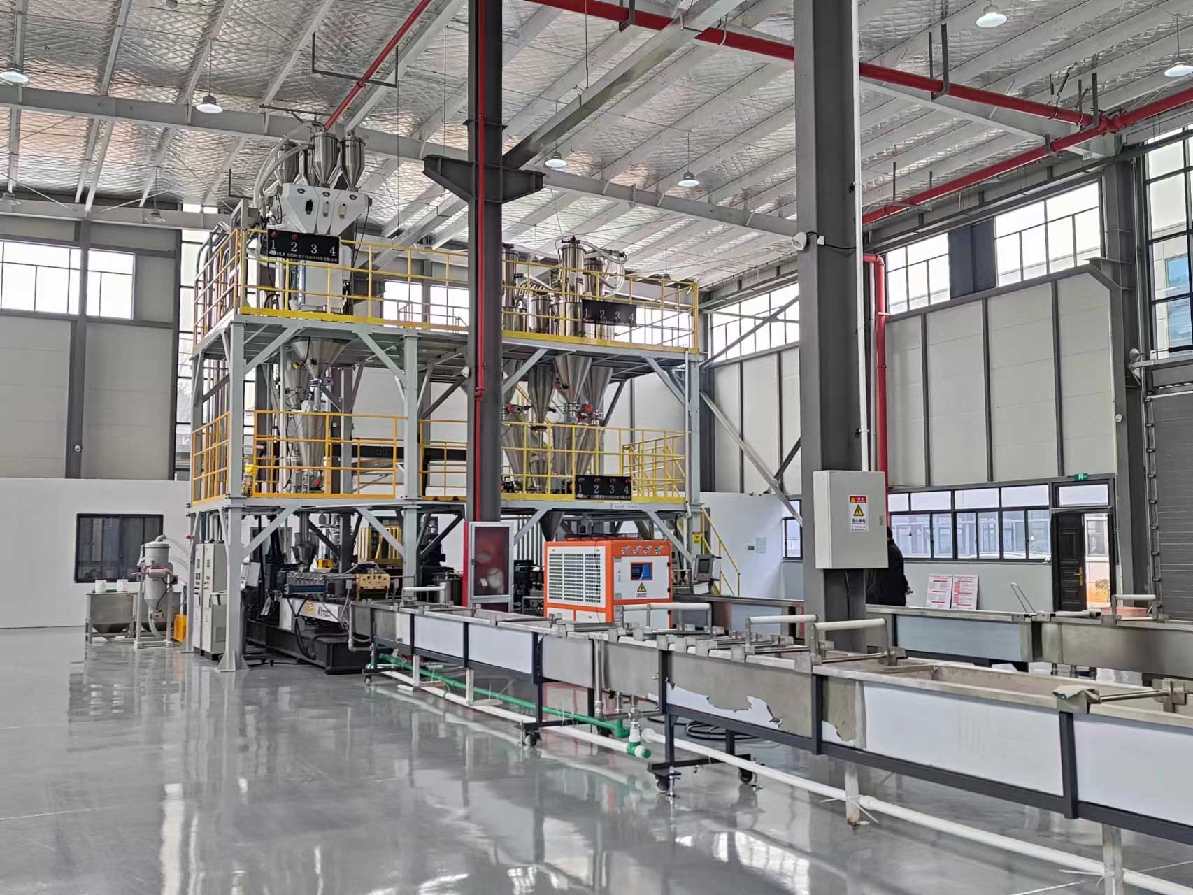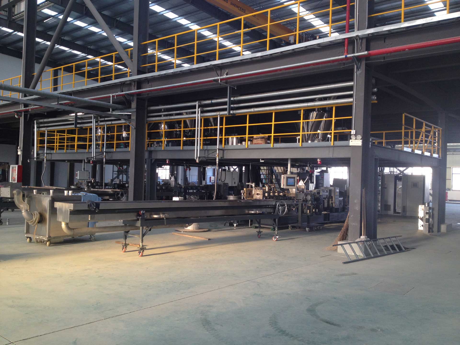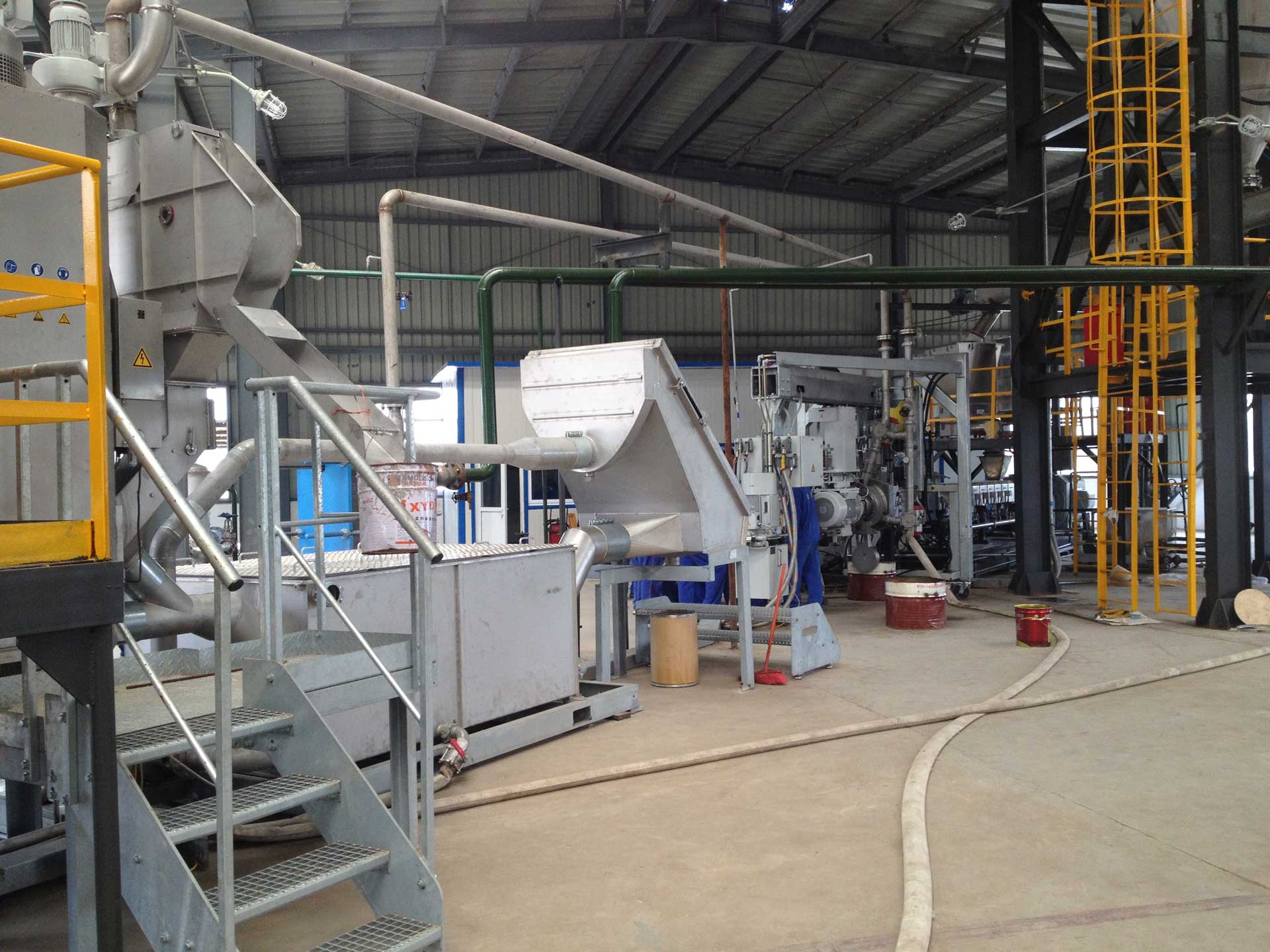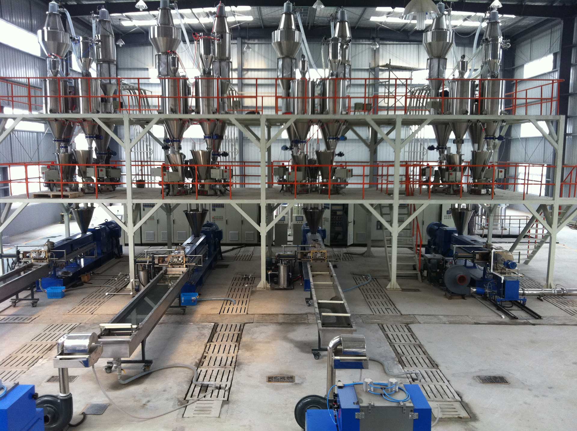 - 同向雙螺桿完成物料的塑化、混煉以及均化,開放無背壓熔體進入單螺桿擠出機完成造粒